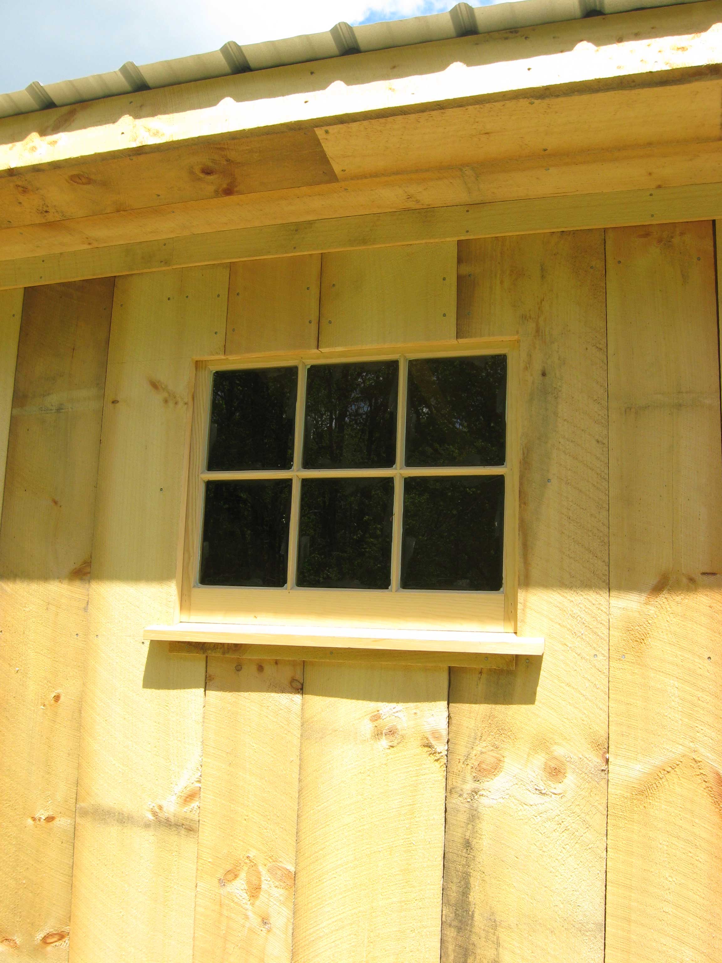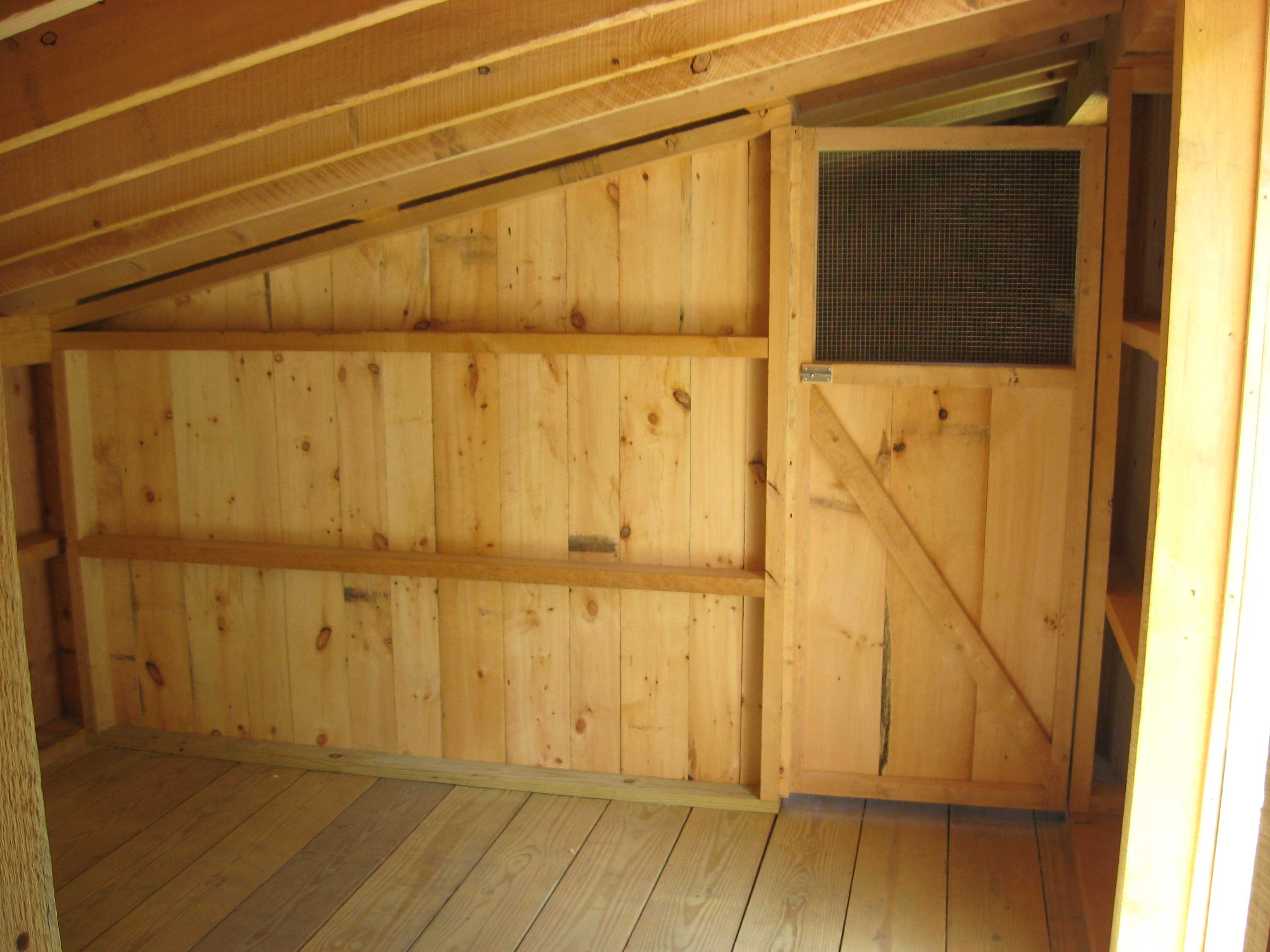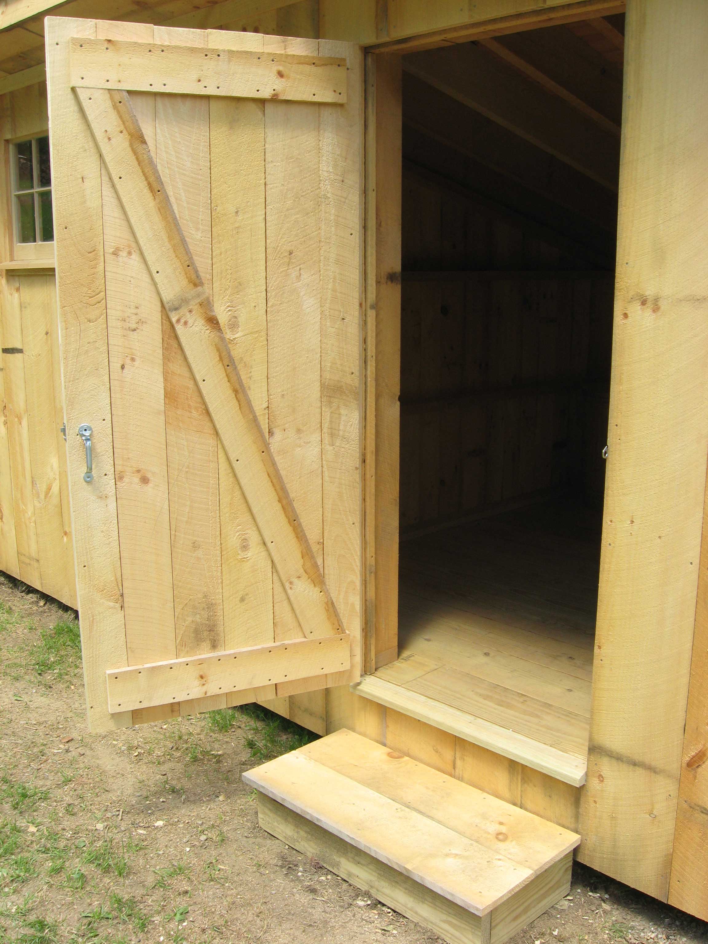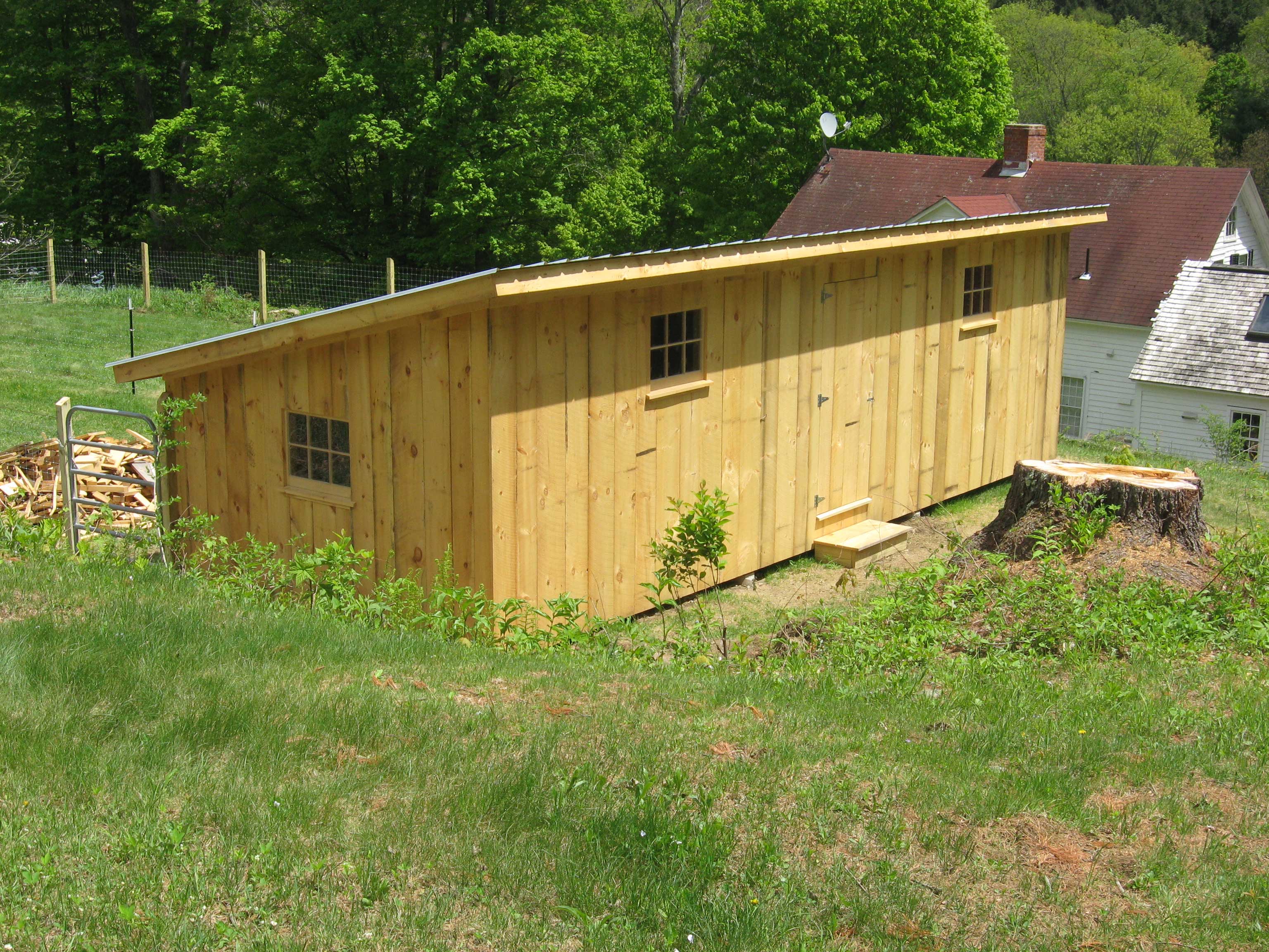 This three-bay 10'x30' shed was designed for miniature horses and goats. The center bay provides hay and feed storage and interior doors leading into the stalls. The flanking animal chambers each have doors leading out to pasture.
